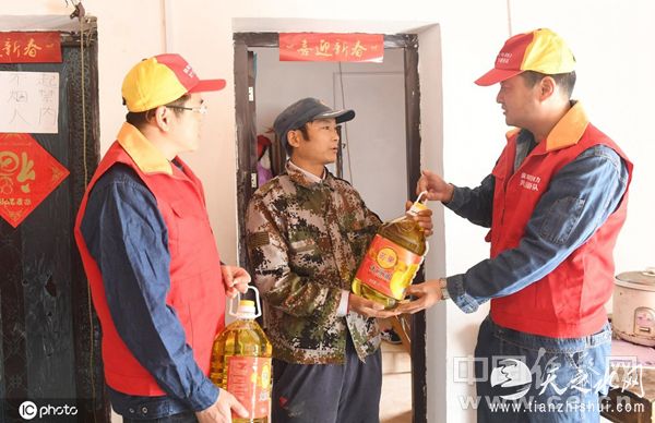2019年5月9日,安徽省滁州市南谯区乌衣镇纪委监察委工作人员和城郊供电公司扶贫帮扶干部在乌衣镇汪郢村建档立卡贫困户袁立奎(右二)家中回访,并送上大米和食用油。(图片来源:东方IC)
