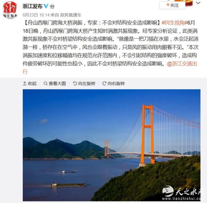 中新网8月24日电 据浙江省人民政府新闻办公室官方微博消息,6月18日晚,浙江舟山西堠门跨海大桥产生短时涡激共振现象。经专家分析论证,此类涡激共振现象不会对桥梁结构安全造成影响。