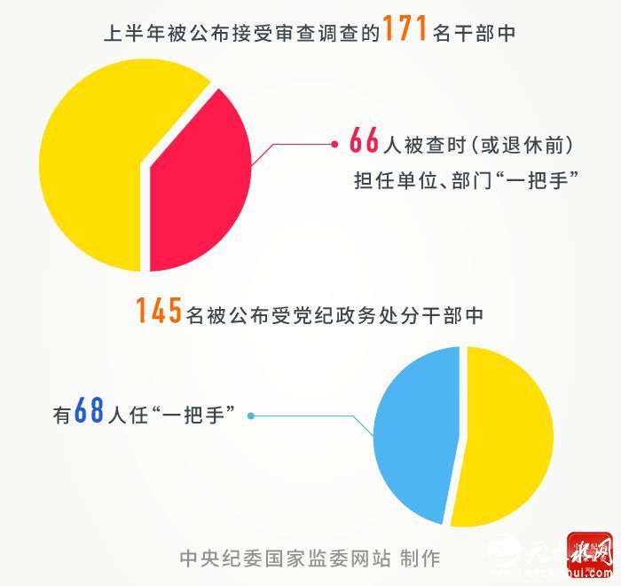 四次全会要求,推动上级“一把手”抓好下级“一把手”,着力破解对“一把手”监督和同级监督难题。统计显示,上半年被公布接受审查调查的171名干部中,66人被查时(或退休前)担任单位、部门“一把手”,被公布受党纪政务处分的145名干部中,则有68人任“一把手”。从查处的案例看,在同一单位、系统或地域工作时间长的领导干部,特别是“一把手”,容易形成盘根错节的人脉关系网和利益网,甚至把自己的工作单位当成私人领地、肆意妄为。