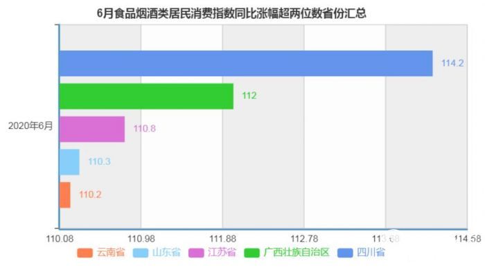 具体省份来看,四川、广西、江苏、山东、云南等5省份食品烟酒类居民消费指数同比涨幅均超两位数,分别为14.2%、12%、10.8%、10.3%、10.2%,值得注意的是,四川、广西的CPI涨幅也居前列。