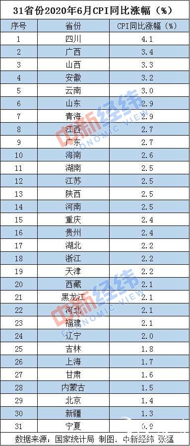 中新经纬客户端梳理发现,分省份来看,四川、广西、山西、安徽、云南、山东、青海、江西、广东、海南等10省份CPI同比涨幅超全国。涨幅前三名的省份分别是四川、广西、山西,数据分别为4.1%、3.4%、3.3%。值得注意的是,四川已连续2个月居涨幅榜首。5月,四川CPI同比涨幅为3.6%。