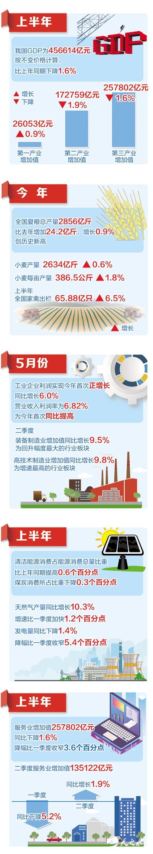 上半年,我国GDP为456614亿元,按不变价格计算,比上年同期下降1.6%。其中,第一产业增加值26053亿元,增长0.9%;第二产业增加值172759亿元,下降1.9%;第三产业增加值257802亿元,下降1.6%。
