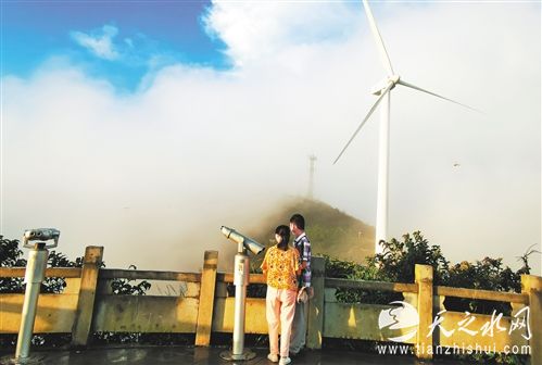 8月10日,雨后初晴的湖北通山县九宫山景区云雾缭绕,游客在现场欣赏美景。(记者 柳洁摄)