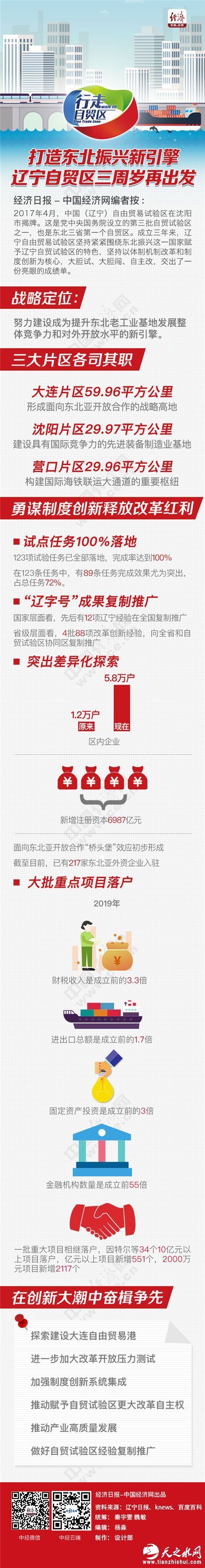 经济日报-中国经济网编者按:2017年4月,中国(辽宁)自由贸易试验区在沈阳市揭牌。这是党中央国务院设立的第三批自贸试验区之一,也是东北三省第一个自贸区。成立三年来,辽宁自由贸易试验区坚持紧紧围绕东北振兴这一国家赋予辽宁自贸试验区的特色,坚持以体制机制改革和制度创新为核心,大胆试、大胆闯、自主改,交出了一份亮眼的成绩单。