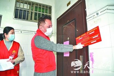 3月6日,伊朗义乌商会会长哈米(右)在鸡鸣山社区樊村一尚未返回义乌的外籍居民家门口张贴多语言防疫提醒。浙江省义乌市的鸡鸣山社区被称为“联合国社区”。这里汇聚了2.5万余名流动人口,其中包括来自74个国家的将近1400名外商。新华社发