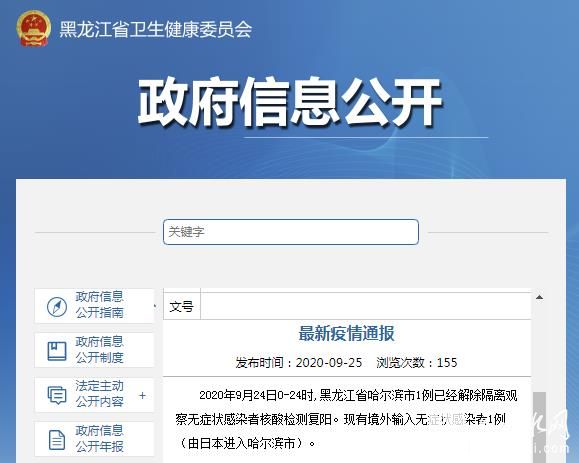 黑龙江哈尔滨1例已解除隔离观察无症状感染者核酸检测复阳 2020-09-25 10:00 中国新闻网 我要评论0 中新网9月25日电 据黑龙江卫健委网站消息,2020年9月24日0-24时,黑龙江省哈尔滨市1例已经解除隔离观察无症状感染者核酸检测复阳。现有境外输入无症状感染者1例(由日本进入哈尔滨市)。 图片来源:黑龙江卫健委网站截图 微笑 流汗 难过 羡慕 愤怒 流泪 复制网址 打印 收藏 0
