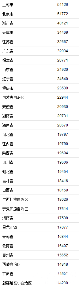 上海和北京的居民收入水平遥遥领先,因为位居第三名的浙江,居民人均可支配收入才刚刚突破4万元大关,达到40121元。