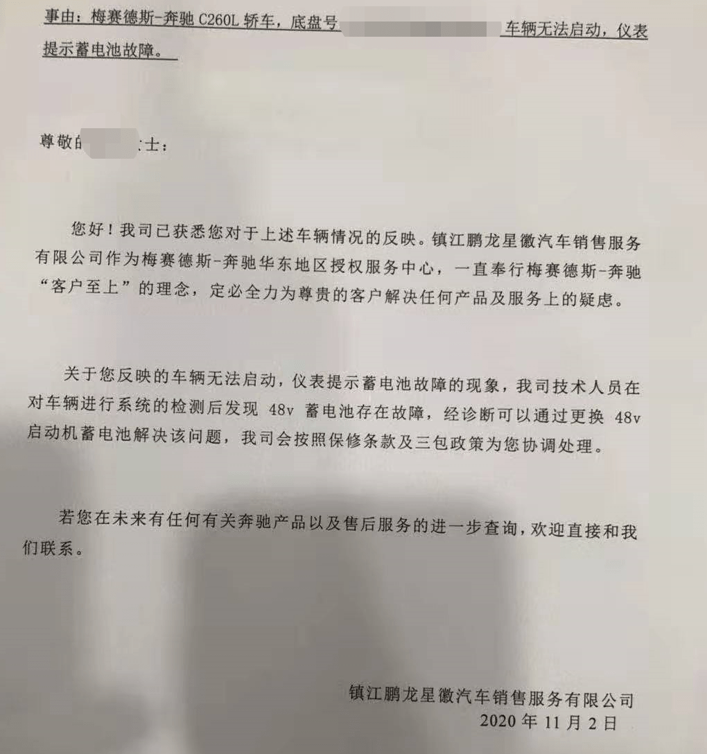 奔驰提车次日故障需换蓄电池,4S店拒退换:不符合三包政策
