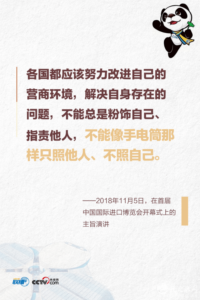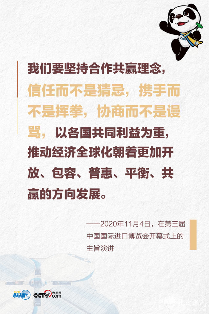 “要坚持合作共赢理念,信任而不是猜忌,携手而不是挥拳,协商而不是谩骂,以各国共同利益为重,推动经济全球化朝着更加开放、包容、普惠、平衡、共赢的方向发展”,“各国走向开放、走向合作的大势没有改变”。