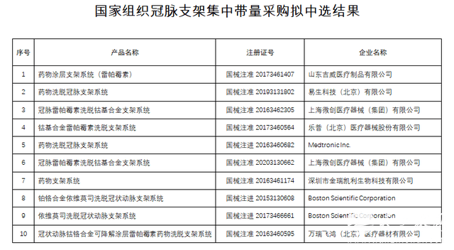 11月5日,首次国家级医疗器械集采结果公布:共计10款冠脉支架产品中标,涉及8家企业。其中微创医疗、Boston Scientific Corporation(波士顿科学)分别有2个产品拟中选,其余乐普医疗、吉威医疗、易生科技等6家公司各有1个产品拟中选。