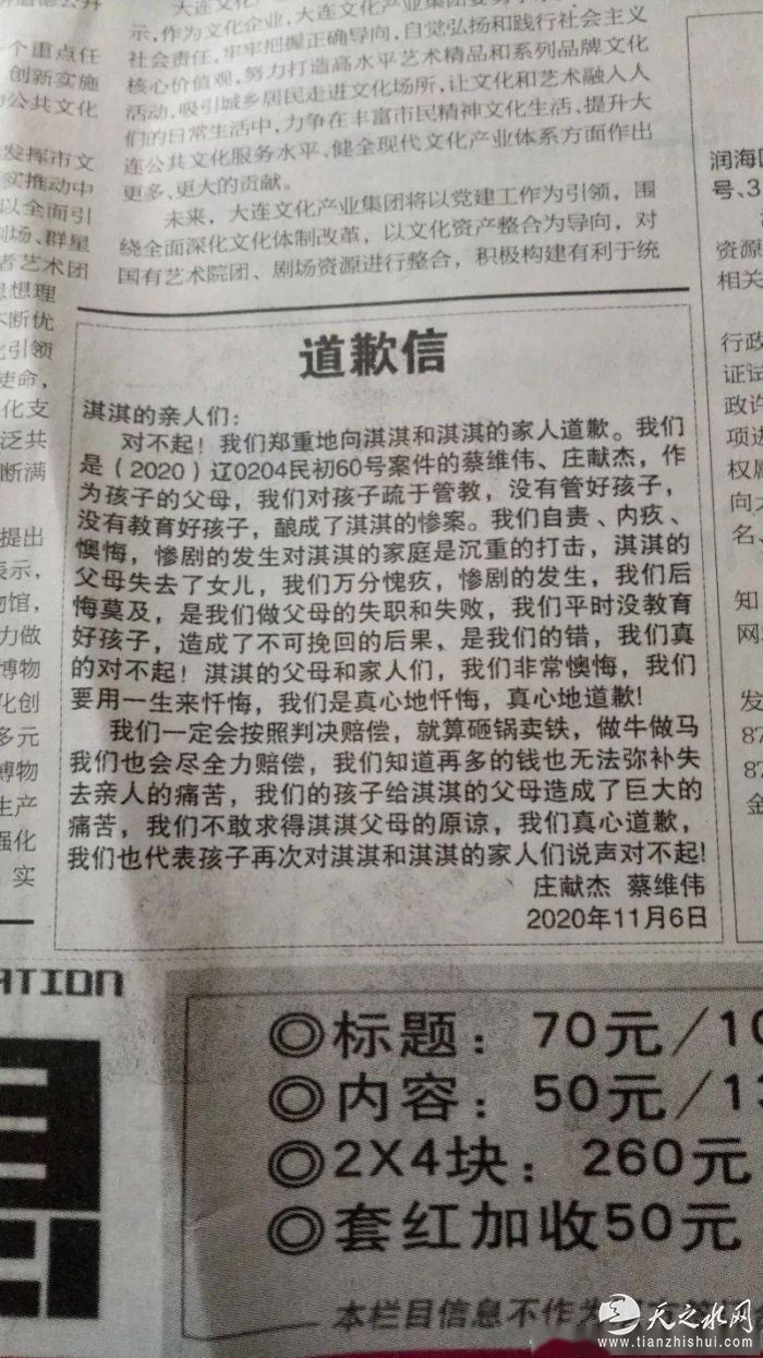 11月6日,在案发383天后,蔡某某的父母在《大连日报》刊登道歉信。南都记者注意到,该道歉信刊登在《大连日报》要闻第3版,道歉信落款为“庄献杰、蔡维伟”。内容道歉称“我们平时没教育好孩子,造成了不可挽回的后果”,并称“一定会按照判决赔偿”。