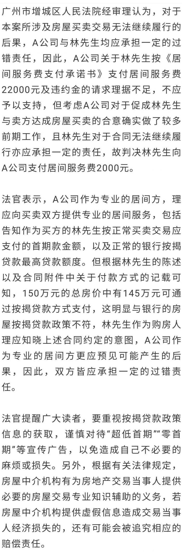 然而,在三方签订了合同之后,林先生却被A公司告知除已支付给卖方的定金5万元外,还要另外支付按揭费用、税费近20多万元,且需要提供虚假银行流水用于按揭。20多万元超出其支付能力,且虚假的银行流水被发现后银行是否会拒绝按揭,会不会承担法律责任,林先生迟疑了,最终,他拒绝支付按揭费用,拒绝继续履行房屋买卖合同,卖方以林先生违约为由没收了其先前支付的5万元定金,A公司也向法院提起诉讼要求林先生支付中介服务费22000元。