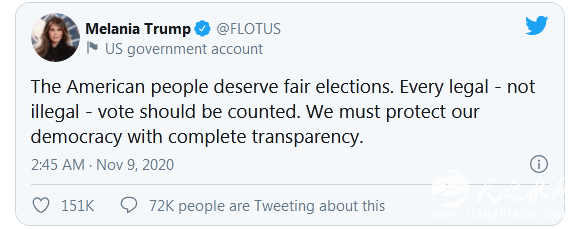 在特朗普这条推文发布前,梅拉尼娅则表示:“美国人应有公正的选举。每一张合法选票都该被计算在内,而不是那些非法的选票。要完全透明来保护我们的民主。”