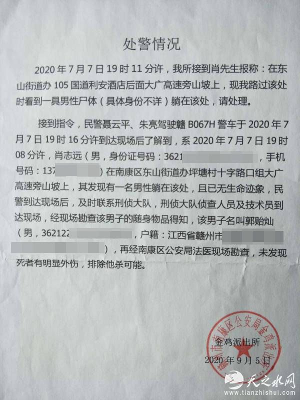 南康区公安局金鸡派出所出具的《处警情况》显示,死者身份确定为郭贻灿,“经法医现场勘查,未发现死者有明显外伤,排除他杀可能。”