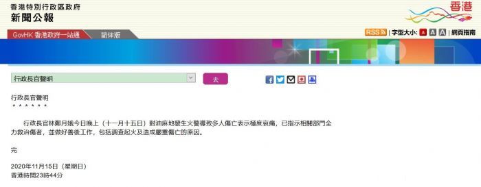 香港特区政府深夜发出公报,行政长官林郑月娥对油麻地发生火警导致多人伤亡表示极度哀痛,已指示相关部门全力救治伤者,并做好善后工作,包括调查起火及造成严重伤亡的原因。