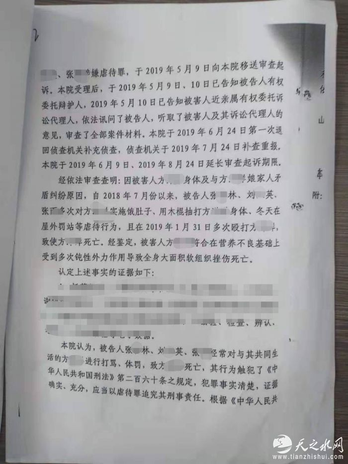 同年2月,方旸的丈夫张某、公公张某林、婆婆刘某英三人被禹城市公安局刑事拘留。后禹城市检察院以涉嫌虐待罪对三人提起公诉。