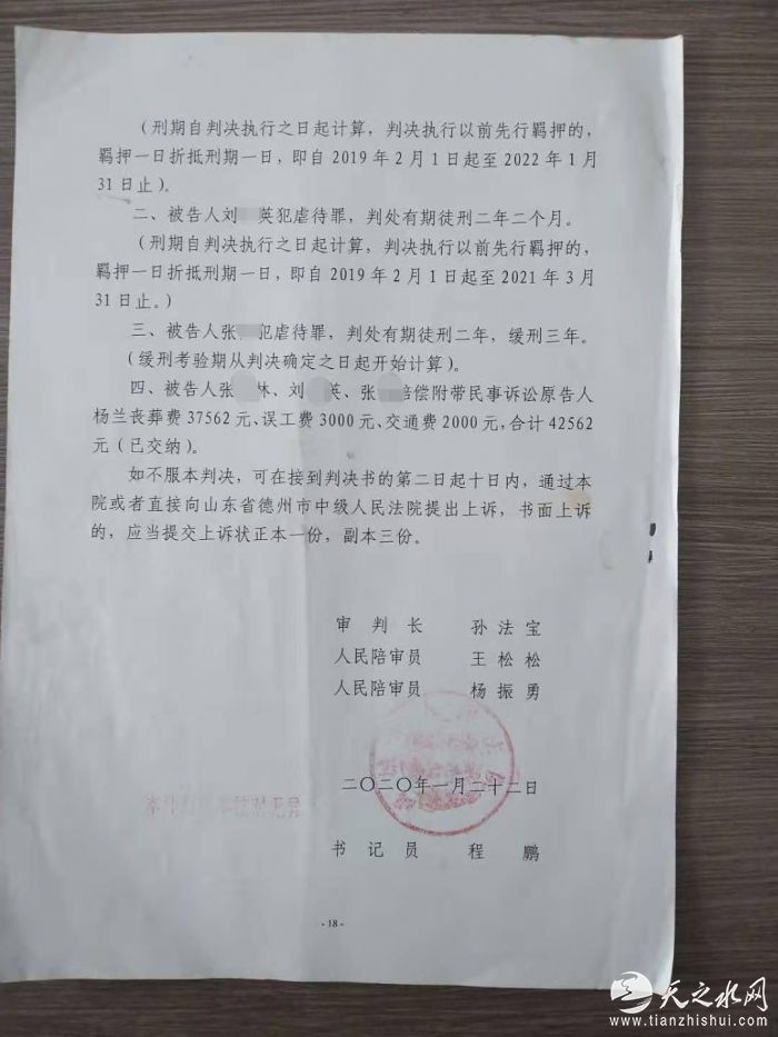 因不能怀孕,山东禹城女子遭公婆及丈夫虐待后死亡。一审法院认为,三名被告人均构成虐待罪,鉴于归案后均能如实供述犯罪事实,并且自愿预交赔偿金5万元,决定从轻处罚。
