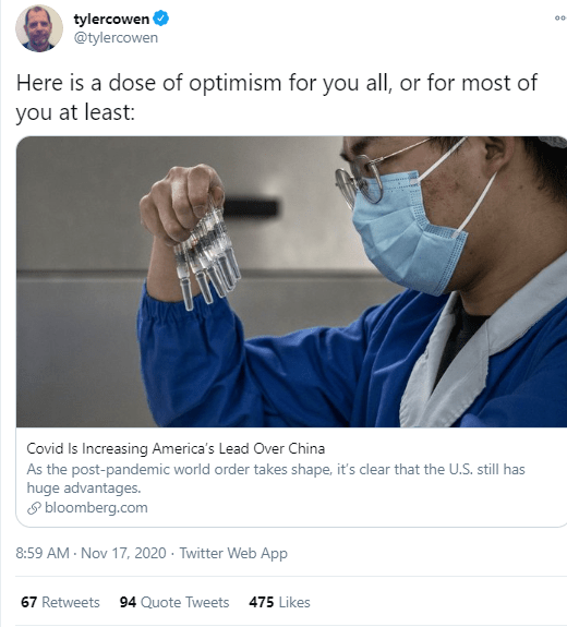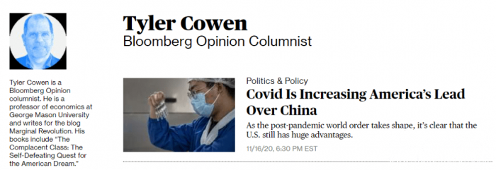 因为撰写此文的一名美国大学教授居然宣称:新冠疫情证明了美国比中国强大,而且比起中国有着“巨大”的优势。