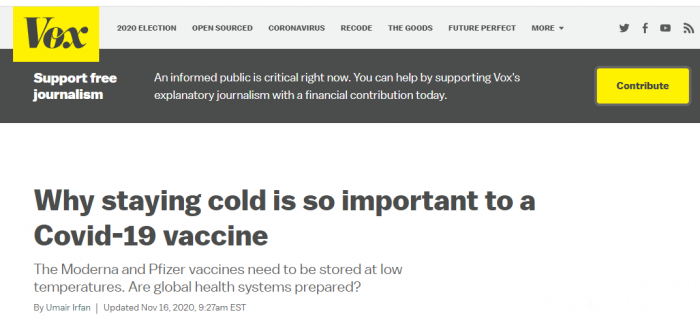 (一些美国媒体自己也指出辉瑞以及美国另一家药厂莫德纳搞出的这种mRNA疫苗最大的难点是对冷链运输的要求极高,物流方面能否支持将是一个巨大挑战)