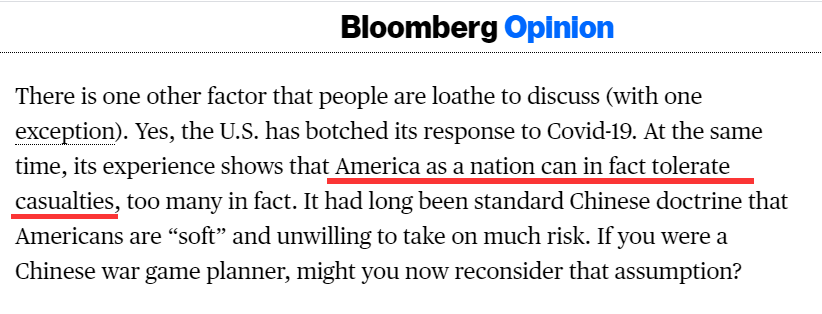 而最最恶心的是,这位美国大教授居然宣称,虽然美国的新冠疫情应对搞砸了,但这也说明“美国不怕死人”,证明了美国不是中国所描述的“软弱不堪”,而且美国的这种“不怕死人”,也将令中国制订针对美国的军事策略时不得不三思。