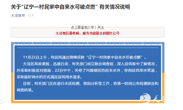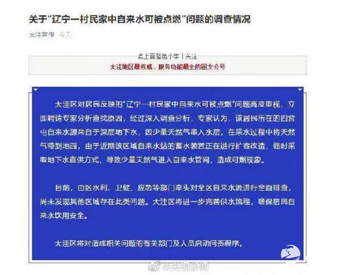 大洼区委宣传部公布调查结果,四营屯自来水可燃系地下天然气混入,自来水可燃事件有关部门人员将被问责。