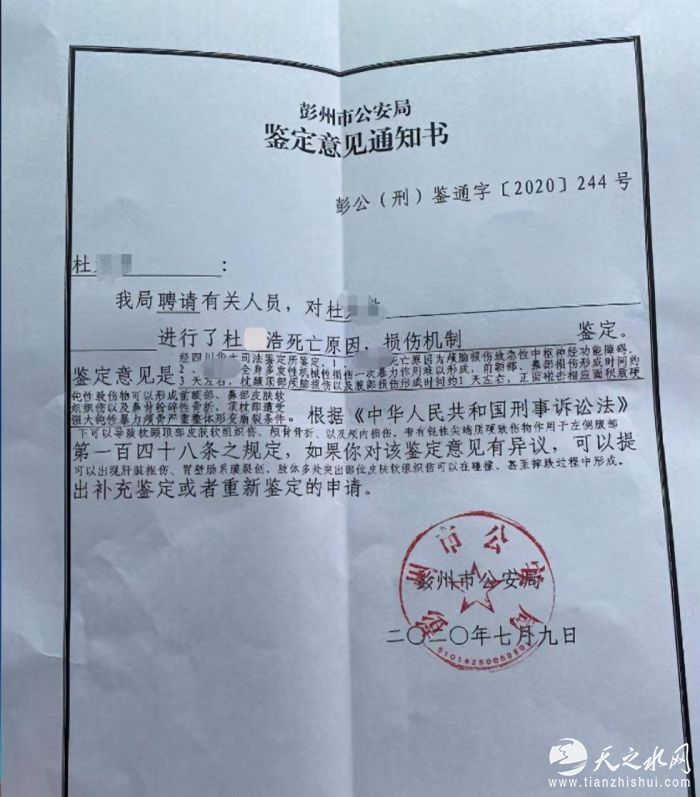 彭州市公安局鉴定意见通知书显示,女童死因为颅脑损伤致急性中枢神经功能障碍