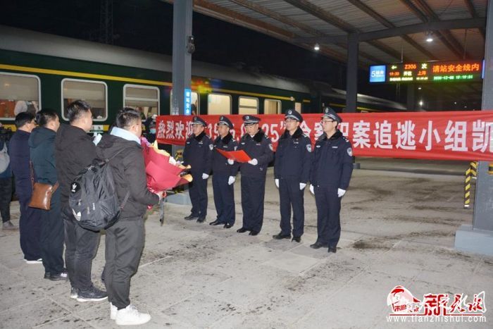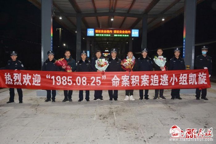 新天水讯【记者 蔚军平】12月8日19时许,天水市武山警方侦破35年前“蔚某故意杀人案”专案组押解犯罪嫌疑人凯旋。市、县两级公安机关负责人到天水火车站迎接专案组,对武山县公安局取得的重大战果表示祝贺,向参与侦查、抓捕、押解工作的民警进行慰问。