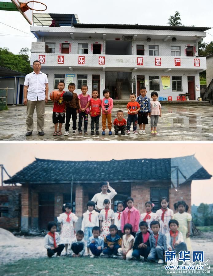拼版照片:上图为2019年8月27日,贵州省龙里县湾滩河镇六广村谷港小学的部分师生在教学楼前合影;下图为80年代贵州省龙里县湾滩河镇六广村谷港小学的师生在老教室前合影