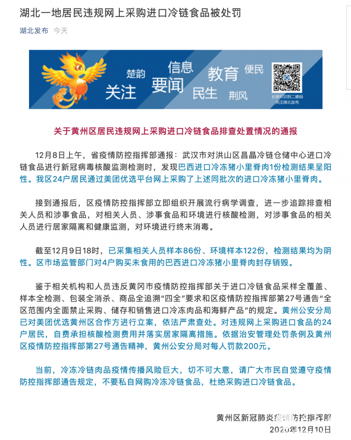 湖北一地24户居民违规网上采购进口冷链食品:每人罚款200元,自费核酸检测