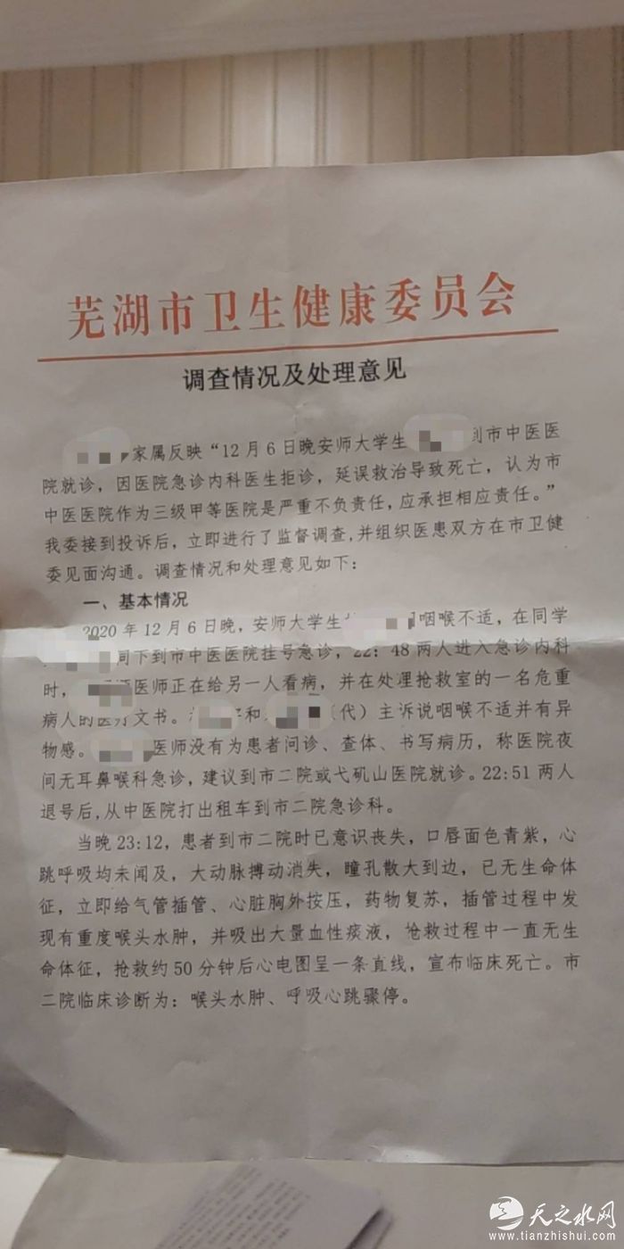 安徽芜湖一大学生转诊时死亡,市卫健委:涉事医生未落实会诊制度