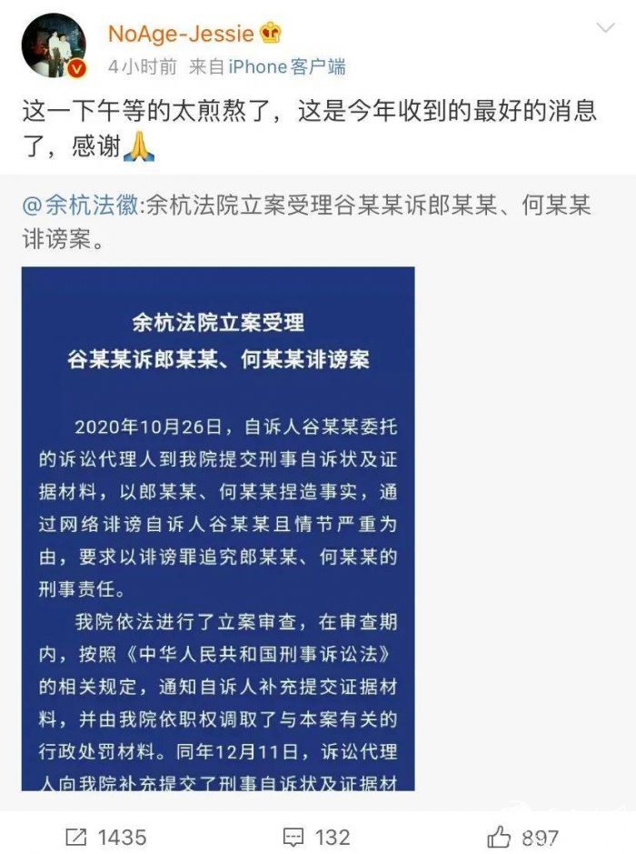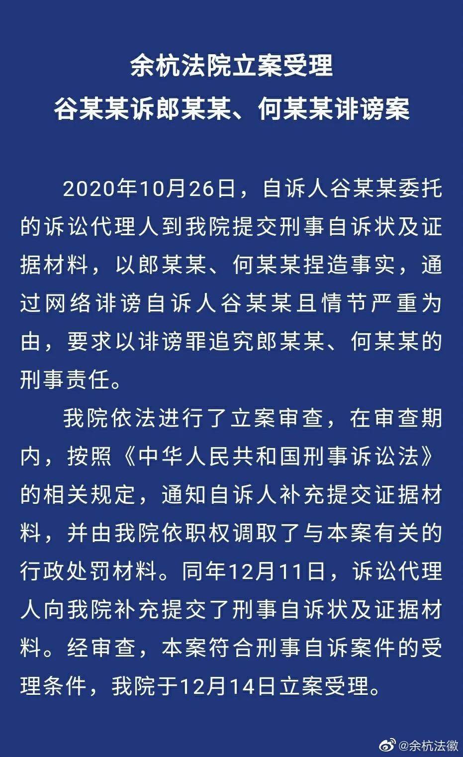 据杭州市余杭区人民法院官方公众号12月14日消息,10月26日,自诉人谷某某委托的诉讼代理人到我院提交刑事自诉状及证据材料,以郎某某、何某某捏造事实,通过网络诽谤自诉人谷某某且情节严重为由,要求以诽谤罪追究郎某某、何某某的刑事责任 。