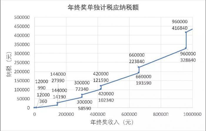 注:上图中,坐标点两行数字第一行为应纳税的收入,第二行为实际缴纳个人所得税额。产生“竖杠”的区域即上文中提及的“断档”。