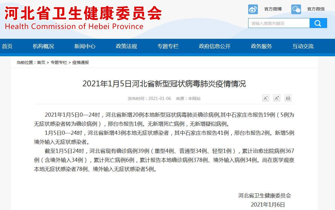 2021年1月5日0—24时,河北省新增20例本地新型冠状病毒肺炎确诊病例,其中石家庄市报告19例(5例为无症状感染者转为确诊病例),邢台市报告1例。无新增死亡病例,无新增疑似病例。