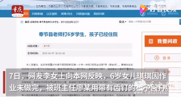 7日,网友李女士在重庆网络问政平台上反映,6岁女儿琪琪在重庆市奉节县西部新区第一小学读一年级。12月31日下午,因午休作业未完成,被班主任廖某用带有齿钉的板子进行殴打,导致双侧臀部大面积淤青,至今住院治疗7天。