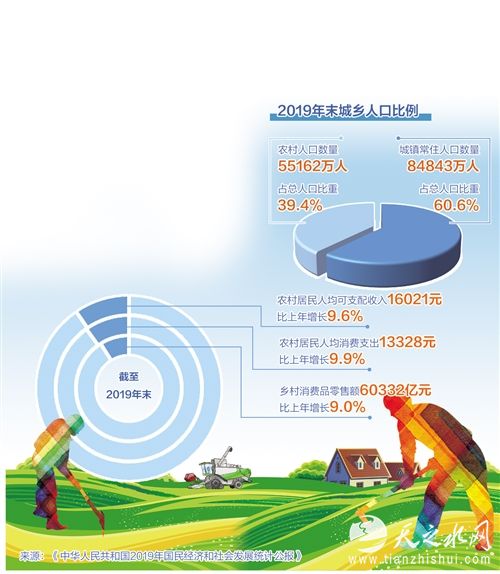 国家统计局最新发布的中国人口数量有关数据显示,截至2019年年末,全国农村人口数量有55162万人,占总人口比重的近四成,如此之大的农村人口消费对形成强大国内市场举足轻重。从全年全国居民人均可支配收入看,城镇居民人均可支配收入42359元,比上年增长7.9%;农村居民人均可支配收入16021元,比上年增长9.6%;城乡居民人均收入倍差为2.64,比上年缩小0.05。近些年,农村居民收支增速一直高于城市居民。从全年全国居民人均消费支出看,2019年城镇居民人均消费支出28063元,比上年增长7.5%;农村居民人均消费支出13328元,比上年增长9.9%,城镇居民人均消费支出与农村居民人均消费支出的比率从2013年的2.47∶1缩小到2019年的2.1∶1。