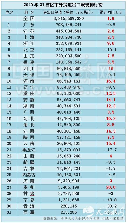 2020年31省区市外贸进出口规模排行榜,数据来源海关总署。经济日报-中国经济网记者宋雅静/制图