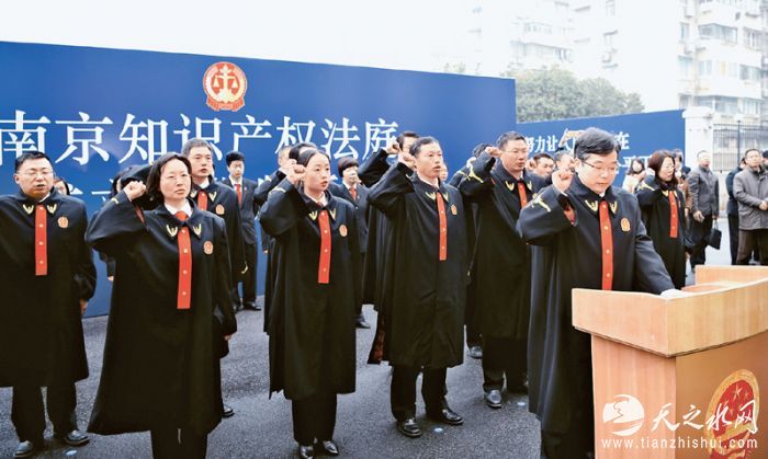 2017年至今,南京、武汉、深圳等22个地方法院知识产权法庭陆续设立,知识产权案件管辖布局不断优化,知识产权专门化审判体系建设不断深入。图为2017年1月19日南京知识产权法庭揭牌当日,全体法官进行宪法宣誓。 南京市中级人民法院供图