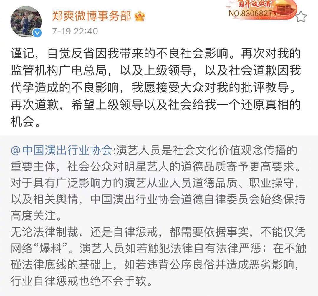 原标题:郑爽再次为代孕事件道歉 希望大家给她一个还原真相的机会