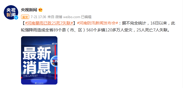 河南防汛新闻发布会:暴雨已致25死7失联 2021-07-21 20:57 来源:央视新闻 我要评论0 【河南暴雨已致25死7失联】河南防汛新闻发布会:据不完全统计,16日以来,此轮强降雨造成全省89个县(市、区)560个乡镇120多万人受灾,25人死亡7人失联。 微笑 流汗 难过 羡慕 愤怒 流泪 责任编辑:赵安生 复制网址 打印 收藏 0