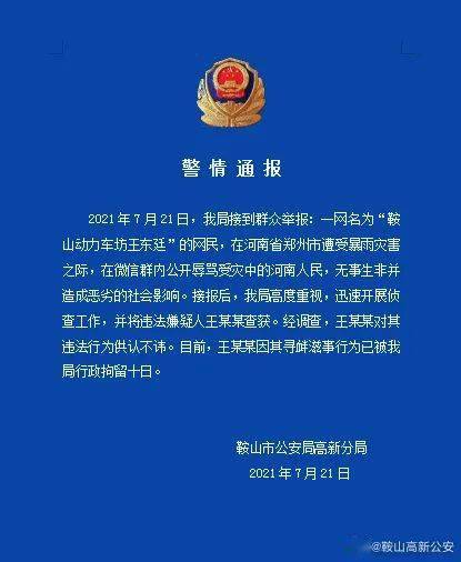 7月21日晚,辽宁省鞍山市公安局高新公安分局官方微博@鞍山高新公安 发布警情通报,一网名为“鞍山动力车坊王东廷”的网民在微信群内公开辱骂受灾河南人民,被行政拘留十日。
