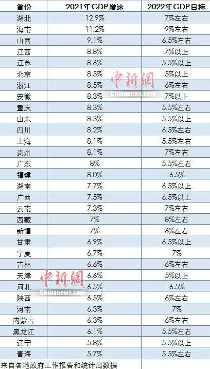 民生银行首席研究员温彬对中新财经记者表示,各个省份明确2022年经济增速等目标,虽然多地目标较去年有所下调。但基本上普遍在5.5%以上,平均在6%左右的水平。