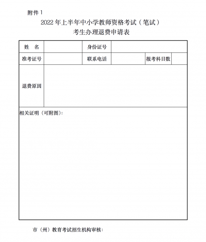 申请退费的考生需填写《2022年上半年中小学教师资格考试(笔试)考生办理退费申请表》(附件1),填写信息须与报名信息一致。填写退费原因,至少1项能证明本人因疫情防控原因未能参加考试的相关材料(如手机短信截图、考试期间“健康码”“行程卡”截图,所在社区张贴的通知公告、属地疫情防控等部门(单位)的相关通知等),截图应清晰完整,并粘贴至附件1中。