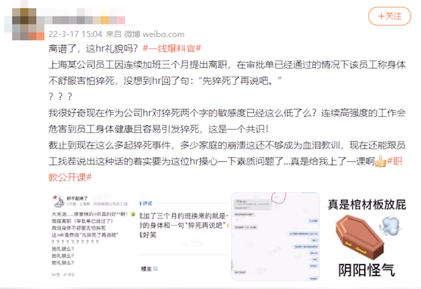 3月17日,网传上海某公司员工离职被HR回复“猝死了再说吧”,引发热议。
