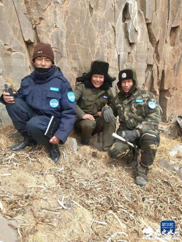 野生动物保护员强巴(右)和同事们在一起(资料照片)。新华社发(受访者供图)