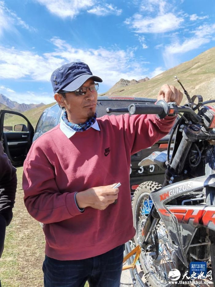 野生动物保护员强巴调试巡逻用的摩托车(资料照片)。新华社发(受访者供图)