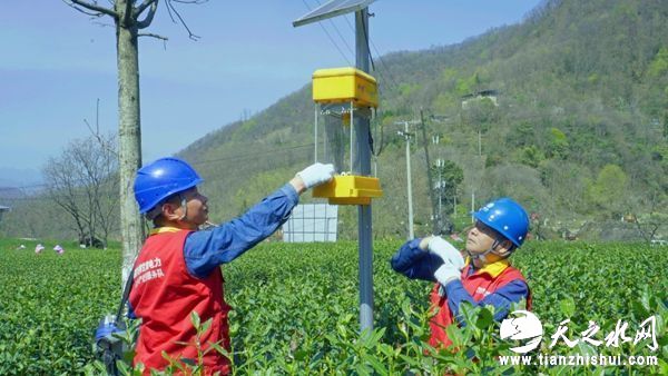 3月21日,国网陇南供电公司碧口供电所台区工作人员在碧口镇马家山御泽春茶园基地检查太阳能驱虫装置。王美惠摄