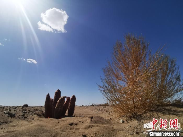 2020年5月,金塔县境内沙漠中人工种植的梭梭长势良好,旁边的肉苁蓉已开花结籽。(资料图) 殷春永 摄