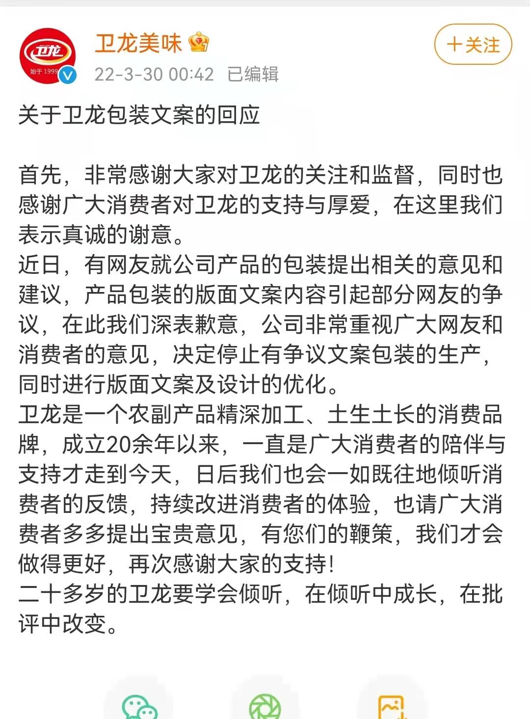 对此,3月30日,卫龙通过官方微博“卫龙美味”发布回应称,有网友就公司产品的包装提出相关的意见和建议,产品包装的版面文案内容引起部分网友的争议,在此深表歉意,公司非常重视广大网友和消费者的意见,决定停止有争议文案包装的生产,同时进行版面文案及设计的优化。