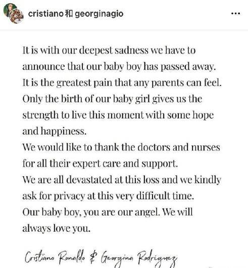 粉丝得知以后悲痛欲绝,C罗老师也是十分难过。不过好在女儿顺利出生了,这让C罗心里多少有了一些安慰。他说,“这是为人父母能感受到最严重的伤痛。唯有顺利出生的女儿带来一些希望和幸福,让我们有力量度过这一刻”。