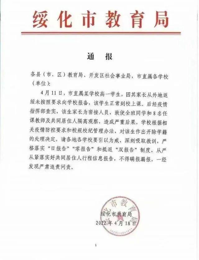 这则落款为绥化市教育局的通报中称,4月11日,市直属某学校高一学生,因其家长从外地返绥未按照要求向学校报备,该学生正常到校上课。后经疫情防控指挥部查实,该生家长为密接人员,致使全班同学和8名任课教师及共同居住人隔离观察,造成严重后果,学校根据疫情防控要求和校规校纪管理办法,对该生作出开除学籍的处理决定。